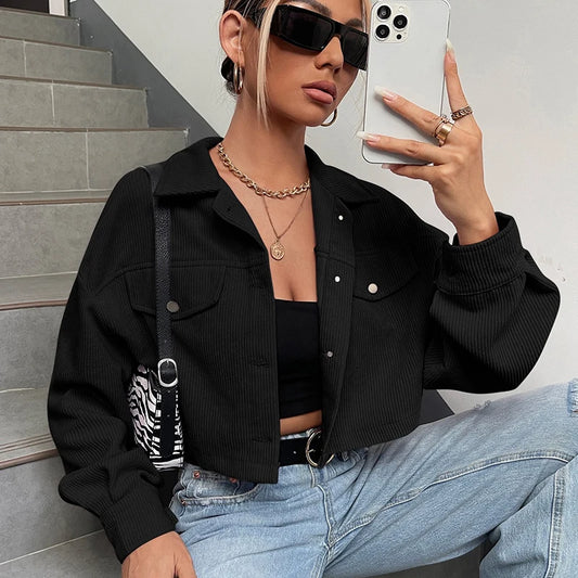 Modische Cord-Cropped-Jacke – Lässige Drop-Shoulder Kurzjacke mit langen Ärmeln und Klappdetails für den Frühling